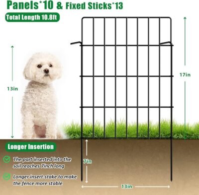 𝗦𝗜𝗭𝗘: Each decorative garden fence panel is 17 inches high, and 7-inch stake inserts into the soil for added stability, with a width of 13 inches, there are a total of 10 panels that can be connected to form a length of 10.8 feet. The garden fencing can also be expanded into different shapes according to your specific needs. 𝗜𝗳 𝘆𝗼𝘂 𝗻𝗲𝗲𝗱 𝘁𝗼 𝗸𝗲𝗲𝗽 𝗼𝘂𝘁 𝘁𝗵𝗲 𝗯𝗶𝗴 𝗱𝗼𝗴𝘀, 𝘆𝗼𝘂 𝗰𝗮𝗻 𝗰𝗵𝗼𝗼𝘀𝗲 𝘁𝗵𝗲 𝟯𝟯-𝗶𝗻 𝗵𝗶𝗴𝗵 𝗳𝗲𝗻𝗰𝗲