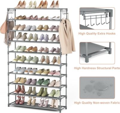 【Large Capacity 10 Tier Wide Shoe Rack】The 10 tier shoe organizer can store up to 50 pairs of adult shoes, and you can remove one layer to fit long boots. This shoe organizer is not only suitable for shoes, but also for bags, toys, towels, sundries, books, plants and small accessories. Shoe storage with 10 hooks, you can hang keys, umbrellas, bags, etc., very practical design.