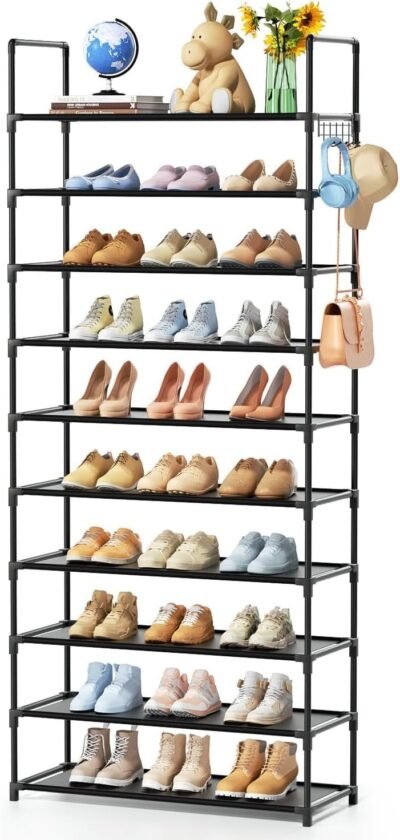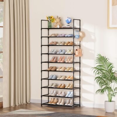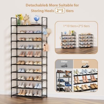 PACKAGE INCLUDE – 1 tall shoe rack with 10 tiers, holding up to 40 pairs of shoes. Perfect for maximizing your closet space and keeping footwear organized in style
