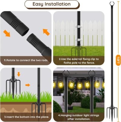 No height restrictions:Made of high quality metal, it will not bend or wobble. The poles for string lights is not limited by its own length, and the excellent load-bearing properties allow you to install it on high fences and walls. Get rid of the general height limitation. You can also hang more number of strings of lights. Also can be applied to banners, lanterns, wind chimes, all kinds of light decoration, etc.