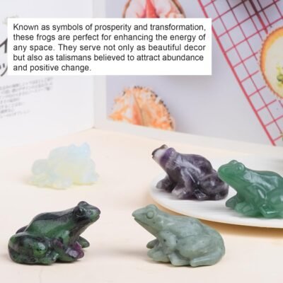 [Decorative Elegance]: Crystal frog sculptures are admired for their elegance and translucence, often symbolizing prosperity, healing, and transformation. These pieces are used in feng shui to attract positive energy and enhance the ambiance of a space. They also serve as decorative accents, adding a touch of sophistication and natural beauty to any setting.