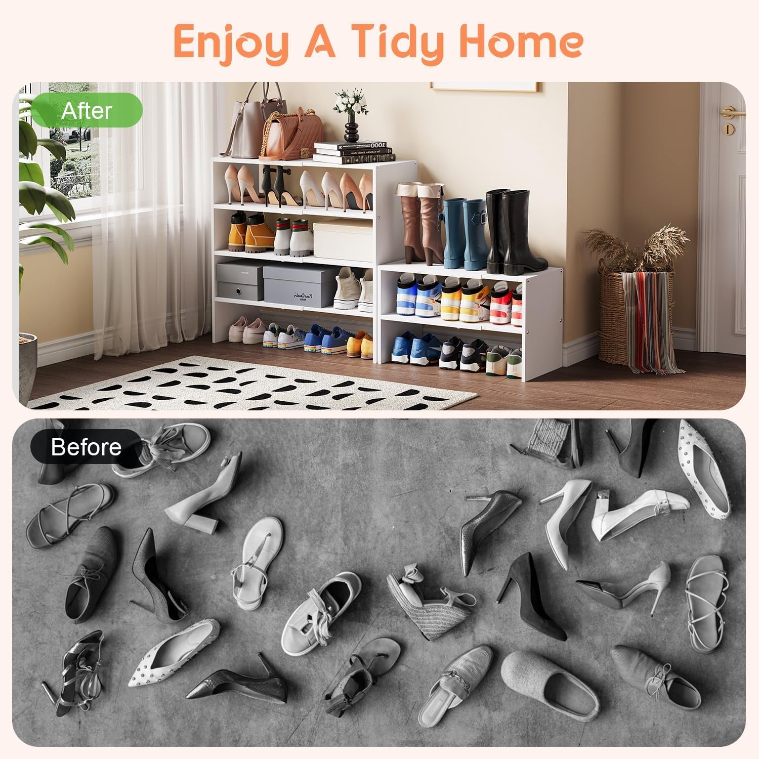 [𝗘𝘅𝗽𝗮𝗻𝗱𝗮𝗯𝗹𝗲 𝗗𝗲𝘀𝗶𝗴𝗻]—Our white shoe rack can each expand from 16.9 inches to 28.3 inches to fit the size of your closet. And it can hold 15 to 24 pairs of shoes to meet your daily need.