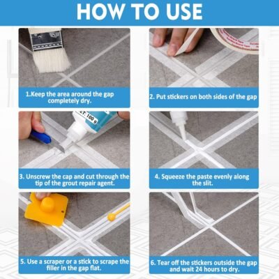 Easy to Use – 1. Keep the area around the gap completely dry. 2. Put stickers on both sides of the gap. 3. Unscrew the cap and cut through the tip of the tile grout agent. 4. Squeeze the tile grout paint evenly along the slit. 5. Use a scraper or a stick to scrape the filler in the gap flat. 6. Tear off the stickers outside the gap and wait 24 hours to dry. With just a few simple steps, you can restore your home to its former glory.