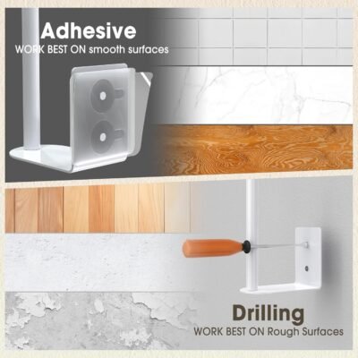 【Three Installation Methods】: 1. Self-adhesive installation, suitable for smooth wall surfaces such as marble tiles and glass. 2. Drilling installation, suitable for rough and uneven surfaces such as painted drywall and wallpaper. 3. Install with screws on the wooden board.