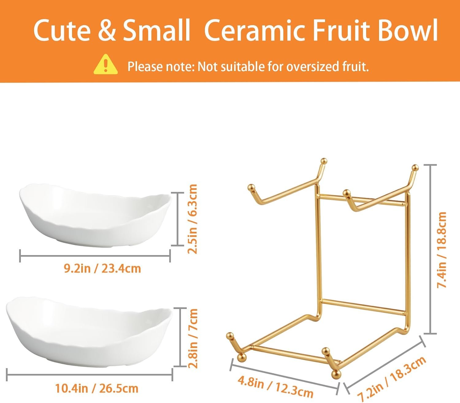 ❤【Small & Cute Fruit Bowls Save Space】: You will get a high-quality 2-tier fruit plate (LxWxH: 7.2×4.8×7.4 inches), including 1 large ceramic bowl (10.4×7.5×2.8 inches), 1 medium ceramic bowl (9.2×6.5×2.5 inches) and a gold metal stand. Not suitable for large fruits.