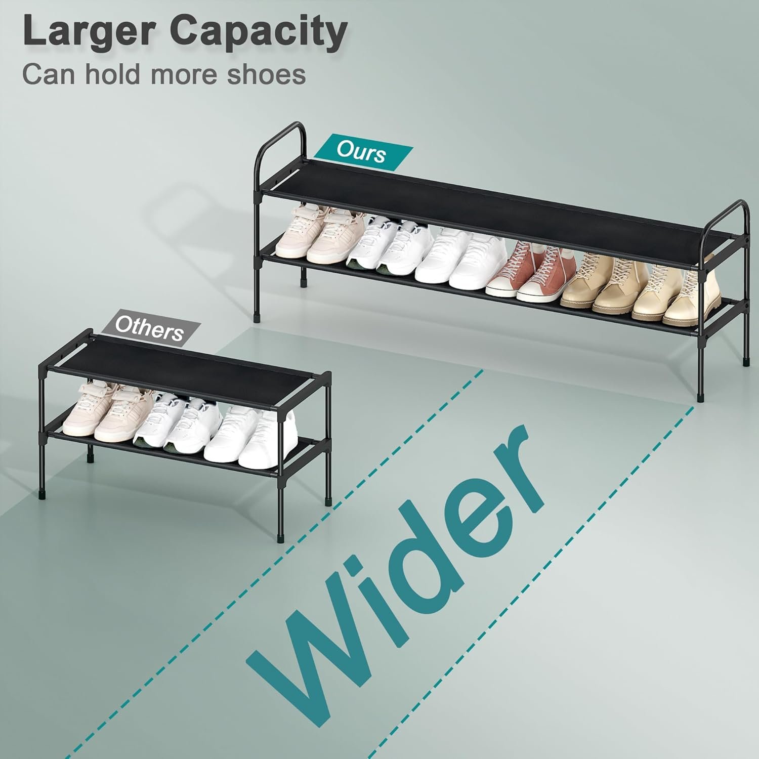 [Longer Size, Larger capacity] Extra long and wide metal shoe rack storage organizer can hold 18-21pairs of shoes. The specially designed low height makes it access easily for the whole family, men, women and kids. Size: 48.5″*12.1″*17.8″