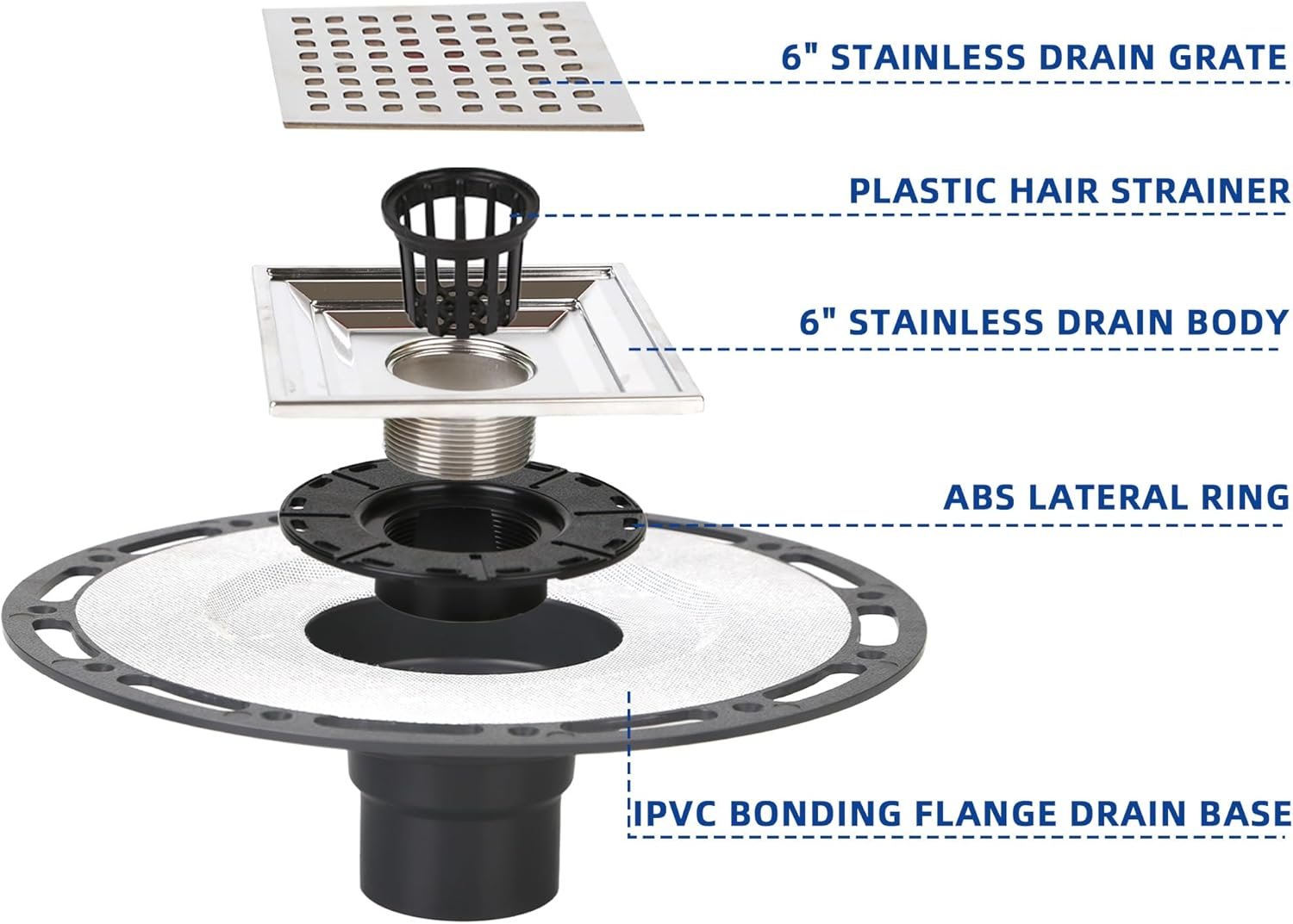 High-Quality Components: The shower drain kit comes with a removable drain grate, a plastic hair strainer, and a variety of accessories, including an ABS lateral adjustment ring and PVC bonding flange. This comprehensive kit covers all your installation needs.