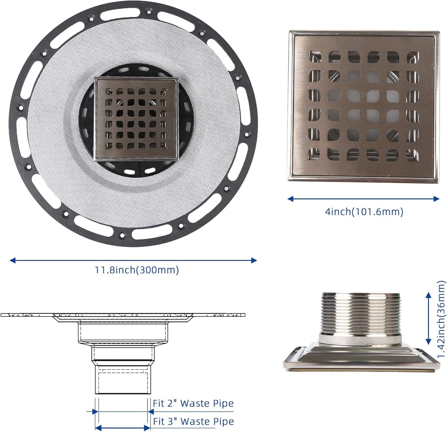 Efficient Drainage Design: The square shower drain includes a 5° sloped tray to ensure smooth water flow and prevent clogging. The central 4-inch grate effectively channels water away, keeping your shower area dry and clean.