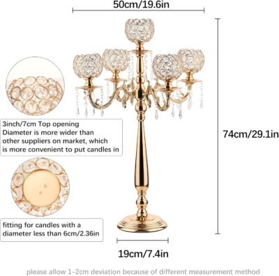 Features Size:29.5 Inches Tall Material:Decorative metal and Crystal. Dimensions:21.6inch/55cmx29.5inch/75cm Color:gold crystal candle holders Warmly Notice
