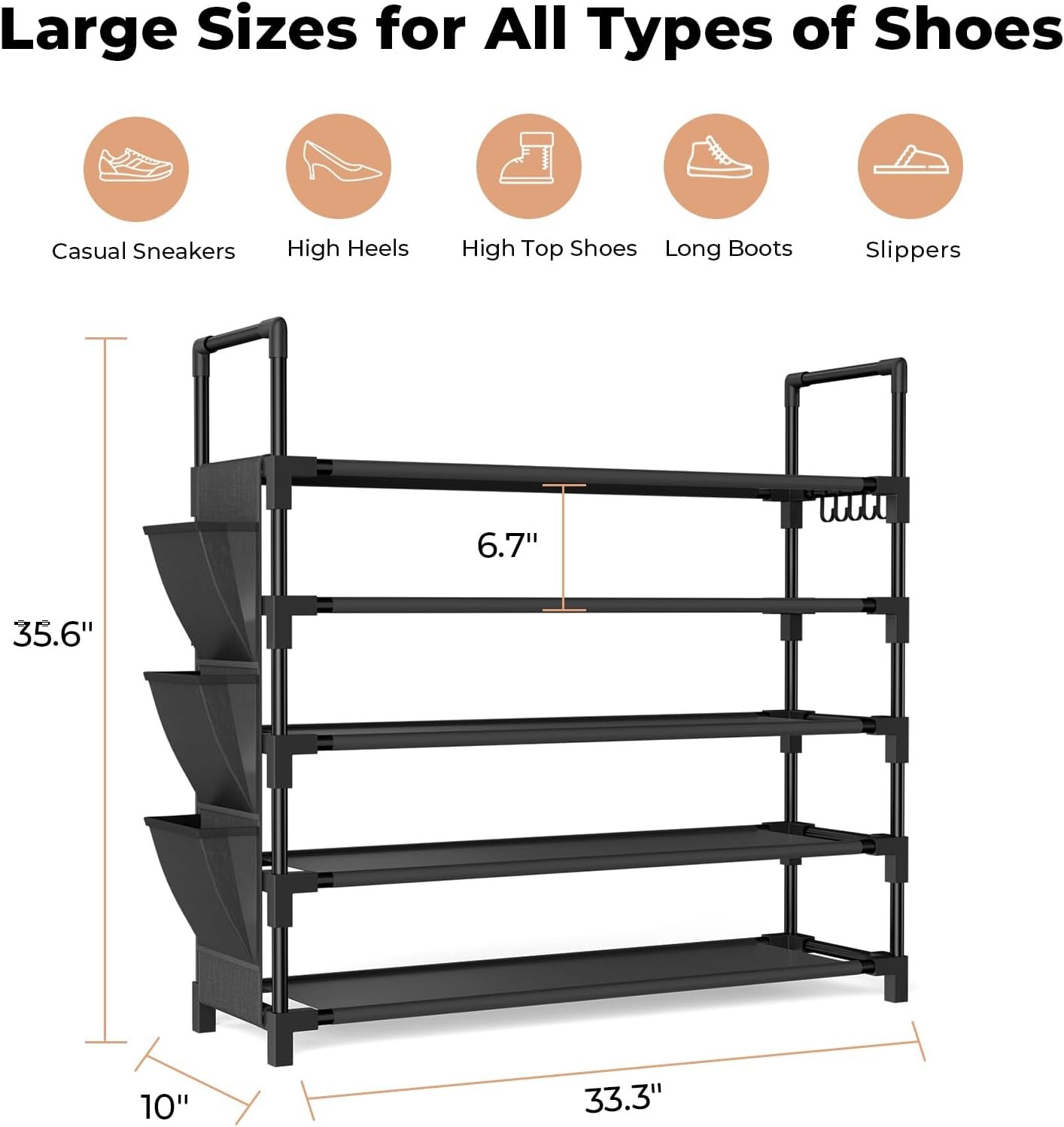 Large Capacity Shoe Rack: The 5 tier shoe rack measures 33.3″W x 10″D x 35.6″H, each layer can hold 4-5 pairs. This closet shoe organizer can easily hold 20-25 pairs of shoes and boots, perfect solution to the problem of family shoe storage