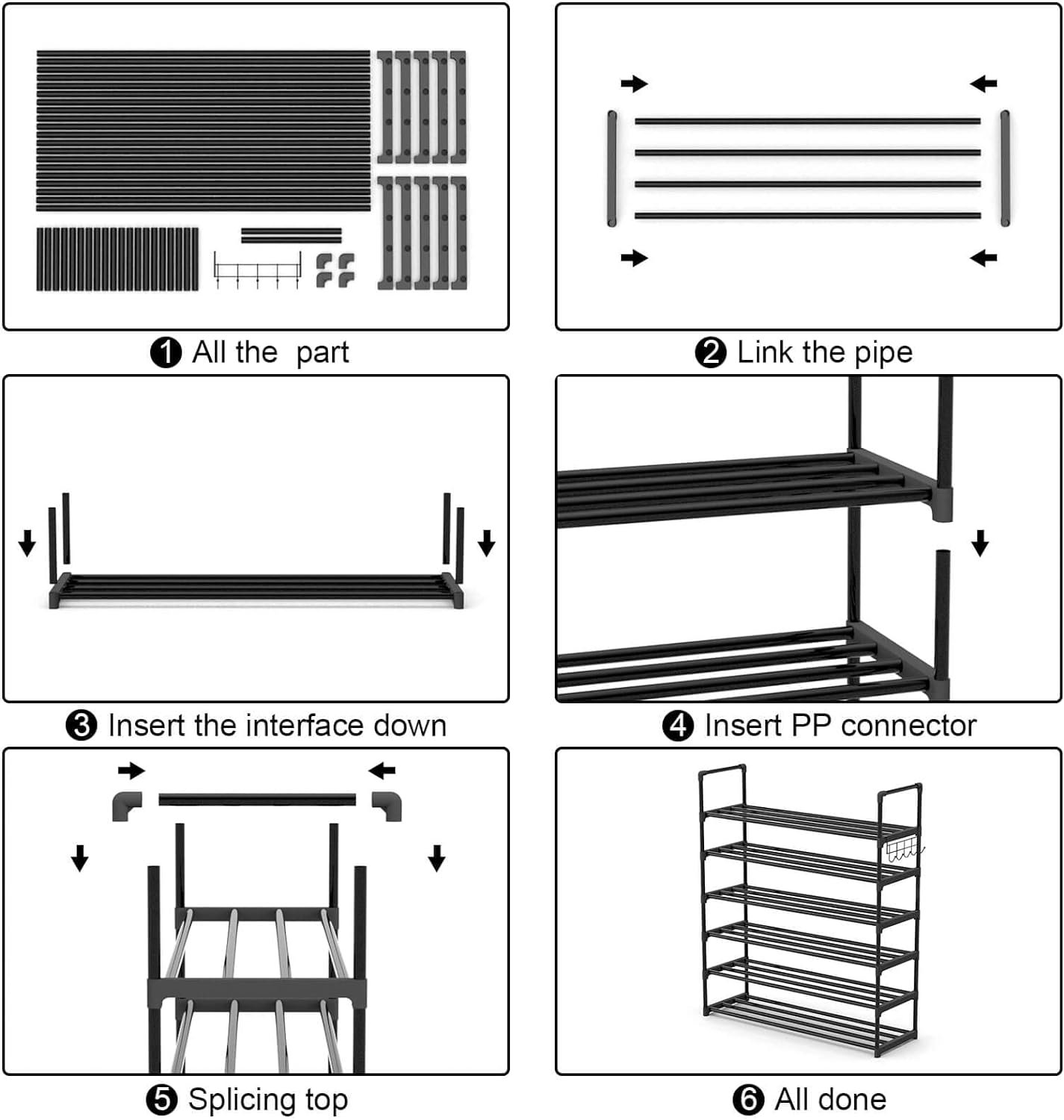 Sturdy and Durable Metal: The 6 tiers shoe rack is made of sturdy and smooth powder coated metal tubing with corrosion resistant and high quality plastic connectors. Stable, each shelf can hold up to 11 pounds and has a long service life.