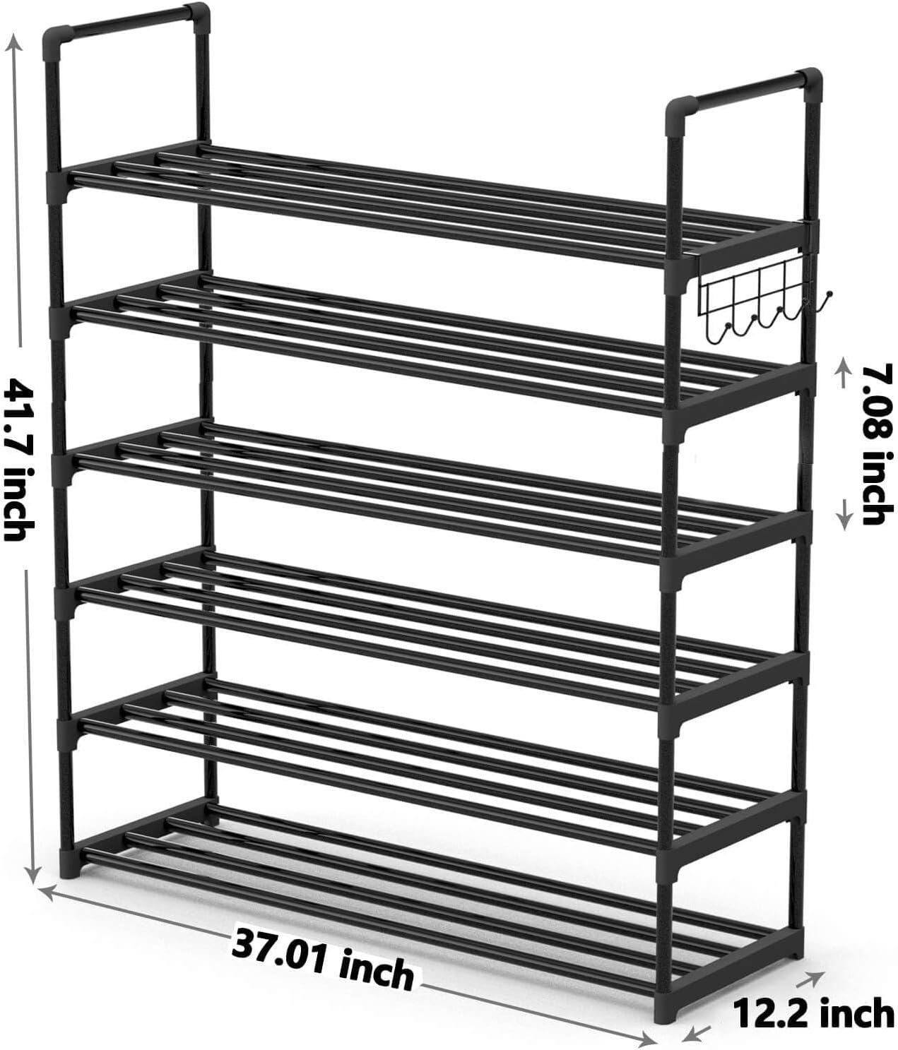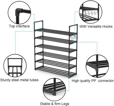 Hsscblet 6-Tier Durable Metal Shoe Rack,Adjustable Shoe Shelf Storage Organizer with Versatile Hooks,Stackable Boot & Shoe Storage,for Entryway,Hallway,Living Room,Closet, Black