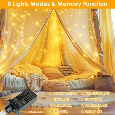 Convenient Timer Function & 8 Modes & Memory Function: The button is at the end of the plug to turn on/off the timer function, press the button for few seconds till the green light on/off to turn on/off the timer function and switch 8 modes (combination, in waves, sequential, slo glo, chasing/flash, slow fade, twinkle/flash, steady on). This fairy lights could remember the setting of previous night you set.