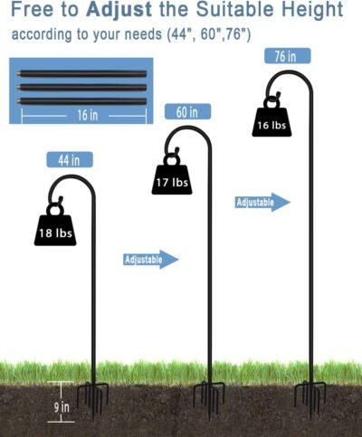 ♥ Extendable & Tall Hook Hanger: The outside shepherd’s hook hanger made of 3/5 inch width & 2mm thickened steel pipe with 5 solid anchor points, you can free to adjust the suitable height for 76’’, 60 ” or 44 “, and also make it stands firmly in the ground without easily falling down, no fear of severe weather such as strong winds, heavy rains, and blizzards, (2 PACK / SET)