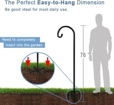 ♥ Super Easy to Assemble & Use: The freestanding 76 inches shepherds hook is quite easy to install or remove down, it comes with 1 base prongs, 1 “S” hook and 3 high-quality steel pipes, each part can be screwed together quickly, no extra tools or accessories needed, just easily place it into the soil or sand with the points.
