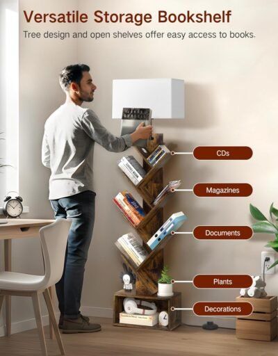 Compact & Space-Saving Design: This floor standing tree bookshelf is perfect for small spaces like bedrooms, living room, home offices, kids room, hallways, or corners. Its slim, compact design helps you maximize floor space while providing ample storage for books, decor, CDs, and more, keeping your room organized and clutter-free. (Dimensions: 56.7″H x 14.6″L x 7.9″W). Available in elegant color finishes to match any home decor.