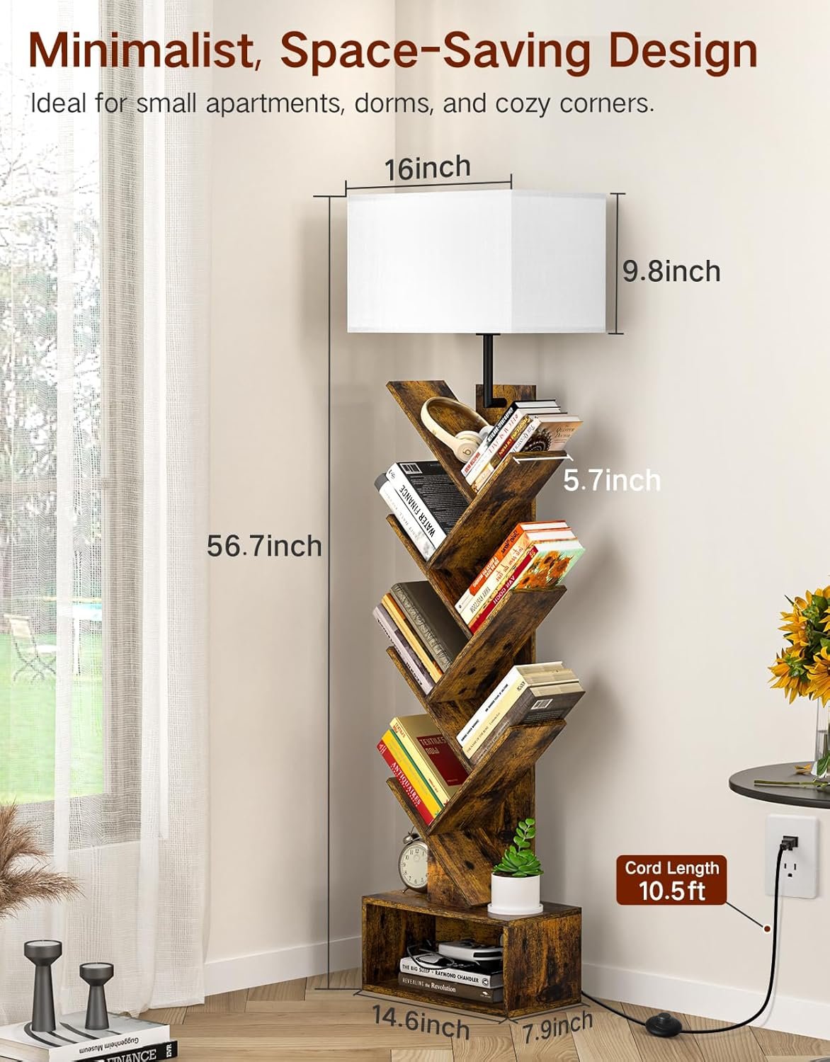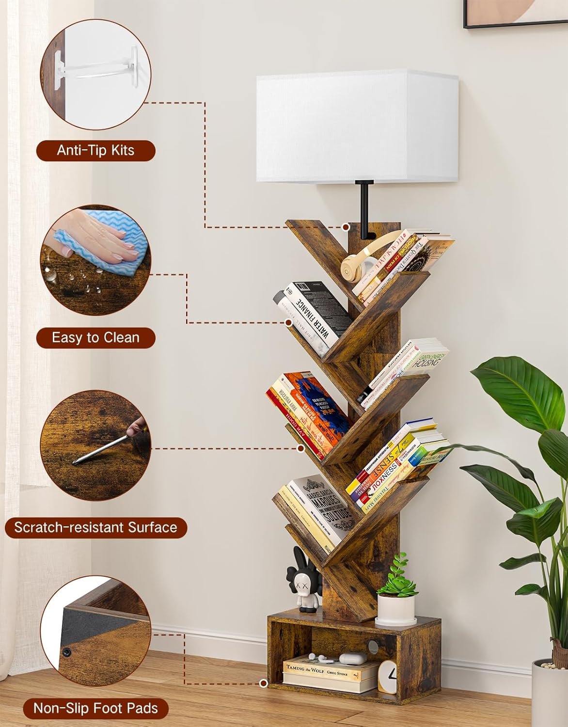 Safety First – Anti-Tip & Kid-Friendly: The standing lamp is made with durable wood panels and equipped with anti-tip wall brackets. Designed to anchor the small bookshelf firmly in place, they add extra stability and help prevent tipping—perfect for homes with curious kids or playful pets. Safety and peace of mind, built right in. Our bookcase lamp features non-slip foot pads that keep it securely in place while protecting your floors from scratches and scuffs.