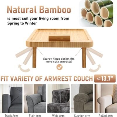 ✅Armrest Shape Versatility – The couch arm table size of the opening angle of the splint can be adjusted, so that the sofa table can adapt to the sofa armrests of different shapes and up to 13.7inches in width to meet the needs of different scenes. (3.5″ flat arms to 13.7″ round arms!)