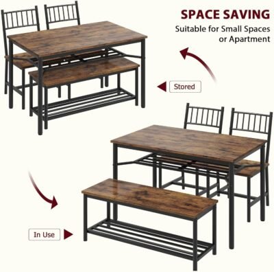 SPACE-SAVING DESIGN: 2 kitchen chairs and 1 bench can be hidden under the kitchen table to save space and create a tidy atmosphere. It is an excellent solution for small spaces, such as condos, kitchens, studios, or apartments.