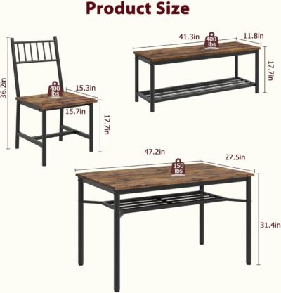 PREMIUM & STURDY CONSTRUCTION: This rustic kitchen table set with a metal frame, which offers a longer service life and more excellent stability. With the premium thickening MDF Board top, the overall durability would be significantly increased. The H-shaped frame of the base makes this kitchen chair and bench more sturdy and durable. The Bench and Chair load-bearing reaches 400 lbs.