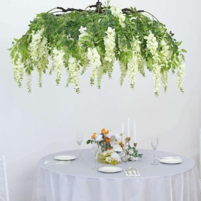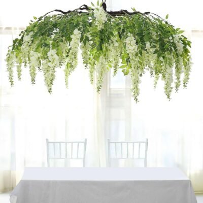 Quantity: 1 Flower Chandelier Flower Type: Wisteria Material: Silk | Metal | Plastic Color: Cream and Green Style: Round Hanging Floral Chandelier Overall Diameter: 55″ Total Flower Bushes: 24 Flower Bush Height: 27″ Base Size: 7.75″Dia. x 5.75″H Total Stems: 6 Stem Size: 13″L x 5″W Each bush has 3 Hanging Strands Features: Realistic, Bendable Wired Stems, Removable Branches, Lightweight Instruction Manual: Included Assembly Required: Yes, easy to assemble