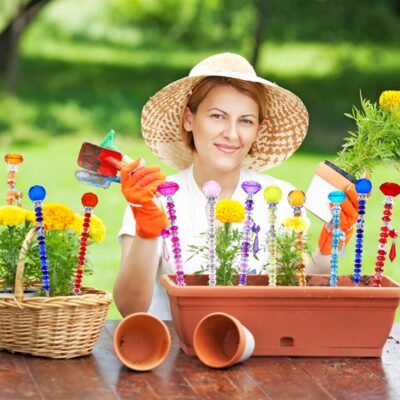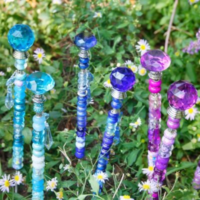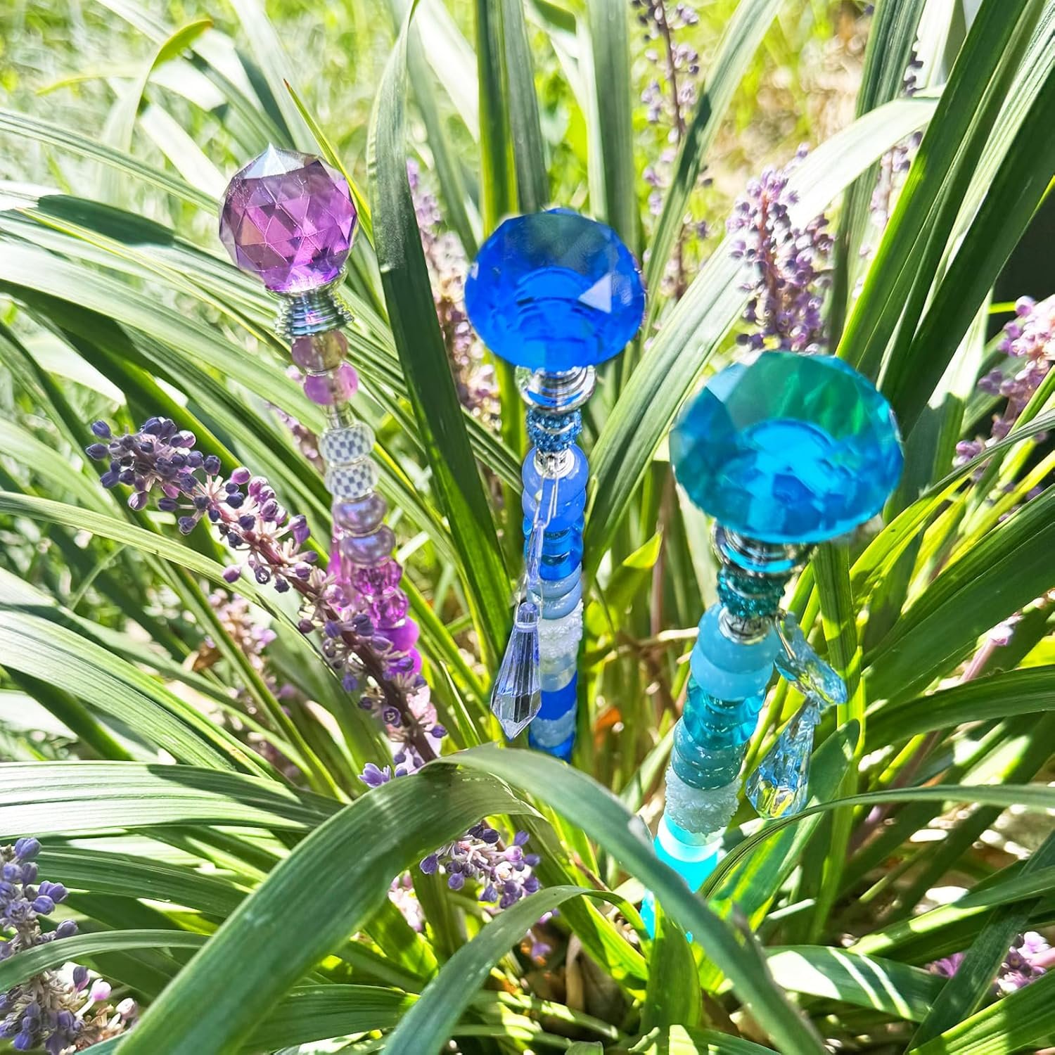 【What Will You Get】Beaded Garden Stakes Kit, 3 Pcs 25cm stainless steel threaded rods, 3 Pcs 30cm stainless steel threaded rods, with 8 stainless steel nuts, 2 Dark Blue Crystal Stopper Tops, 2 Light Blue Crystal Stopper Tops, 2 Purple Crystal Stopper Tops, 6 Colorful Crystal Charms, and 120 Assortment random style Garden Stakes large hole beads ; This will add color and fun to your garden stake creation