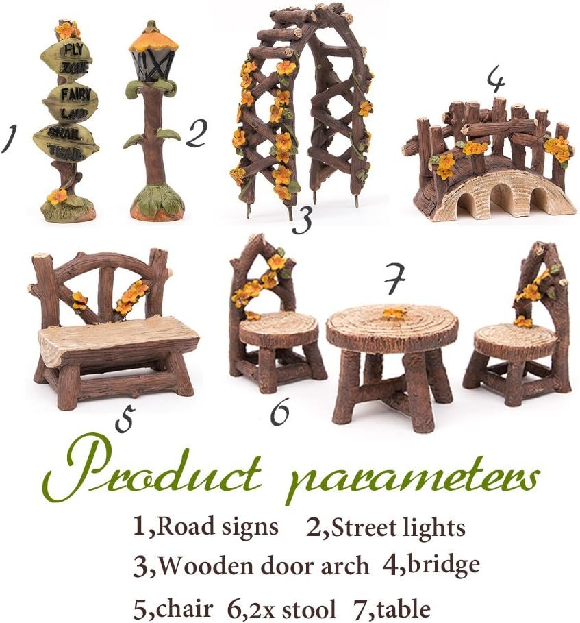 Size and material: Resin, 2 x Stool 38*74mm / Chair 66*65mm / Table 59*43mm / Road Signs 87*23mm / Street lights 83*23mm / Wooden door arch 114*71mm / Bridge 74*53mm
