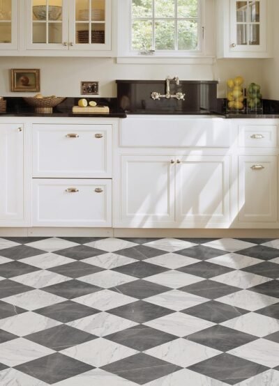Marble inspired peel and stick floor tiles with a checkerboard styling