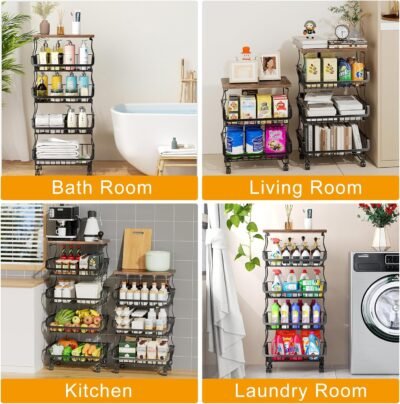 Fruit Basket with Wood Top: 5-tier fruit and vegetable storage basket is multifunctional and practical, sturdy wood top can not only holds kitchen items but also prevent dust from falling, and detachable baskets to fit your space needs.