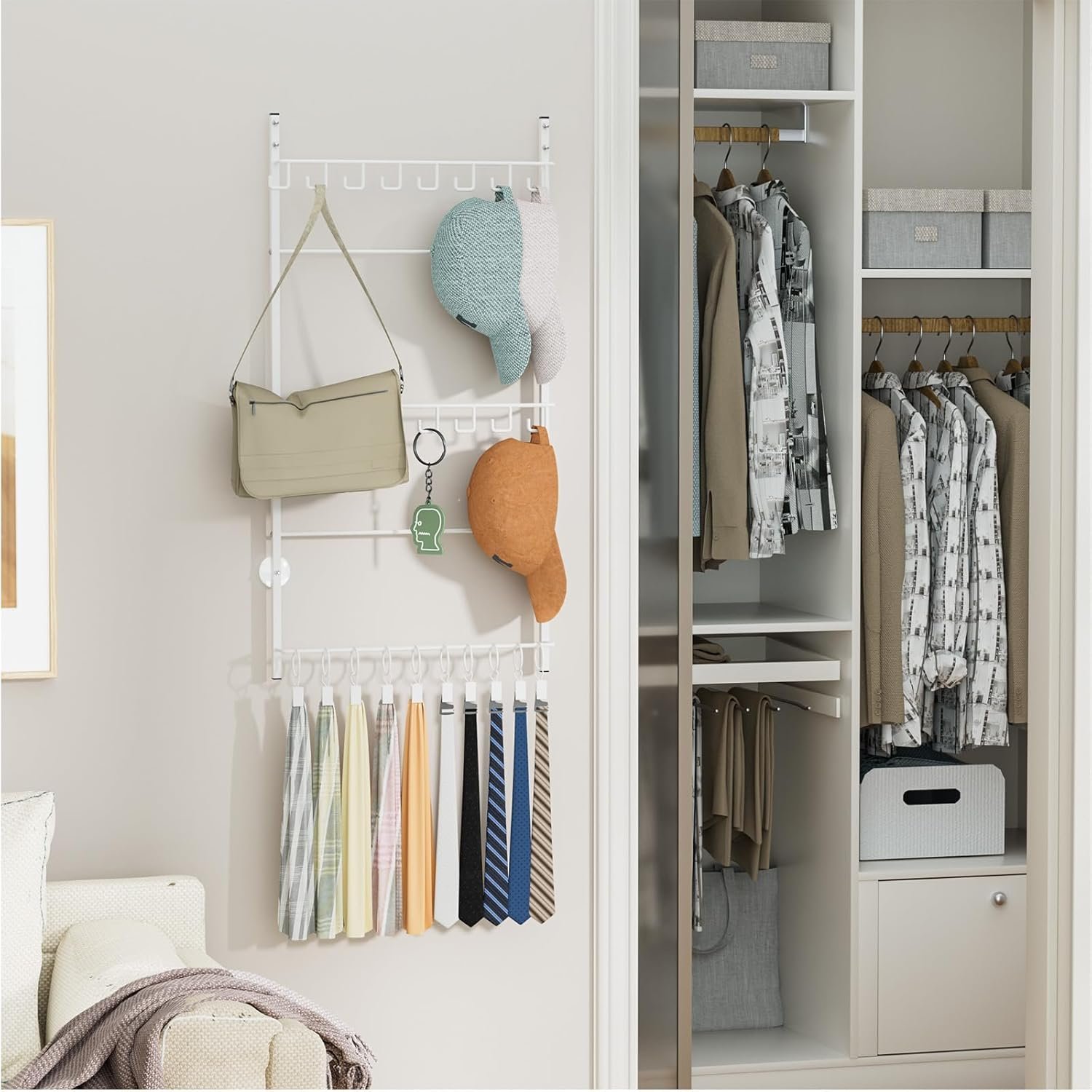 [Large Capability Hat Rack]: Designed with functionality in mind, this baseball cap organizer features 10 pack metal ring with clips and two tiers of hooks, providing ample space to hold 26+ hats. This generous storage space of the hat rack for door accommodates a wide variety of hats, free up your closet space. Stand in front of closet and just pick one right off the hat rack, and no need to sift through a drawer trying to pick a hat for the day