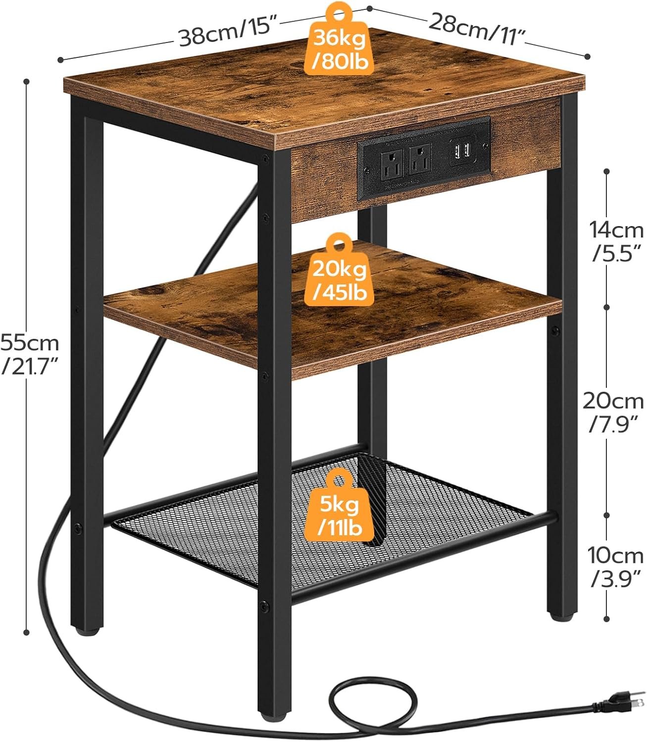 Side Table with Outlets and USB Ports: The charging station includes 2 3-prong AC outlets and 2 USB ports, meeting your needs to charge your phone, desk lamp and laptop freely. 59 inches power cord provides great convenience for daily use