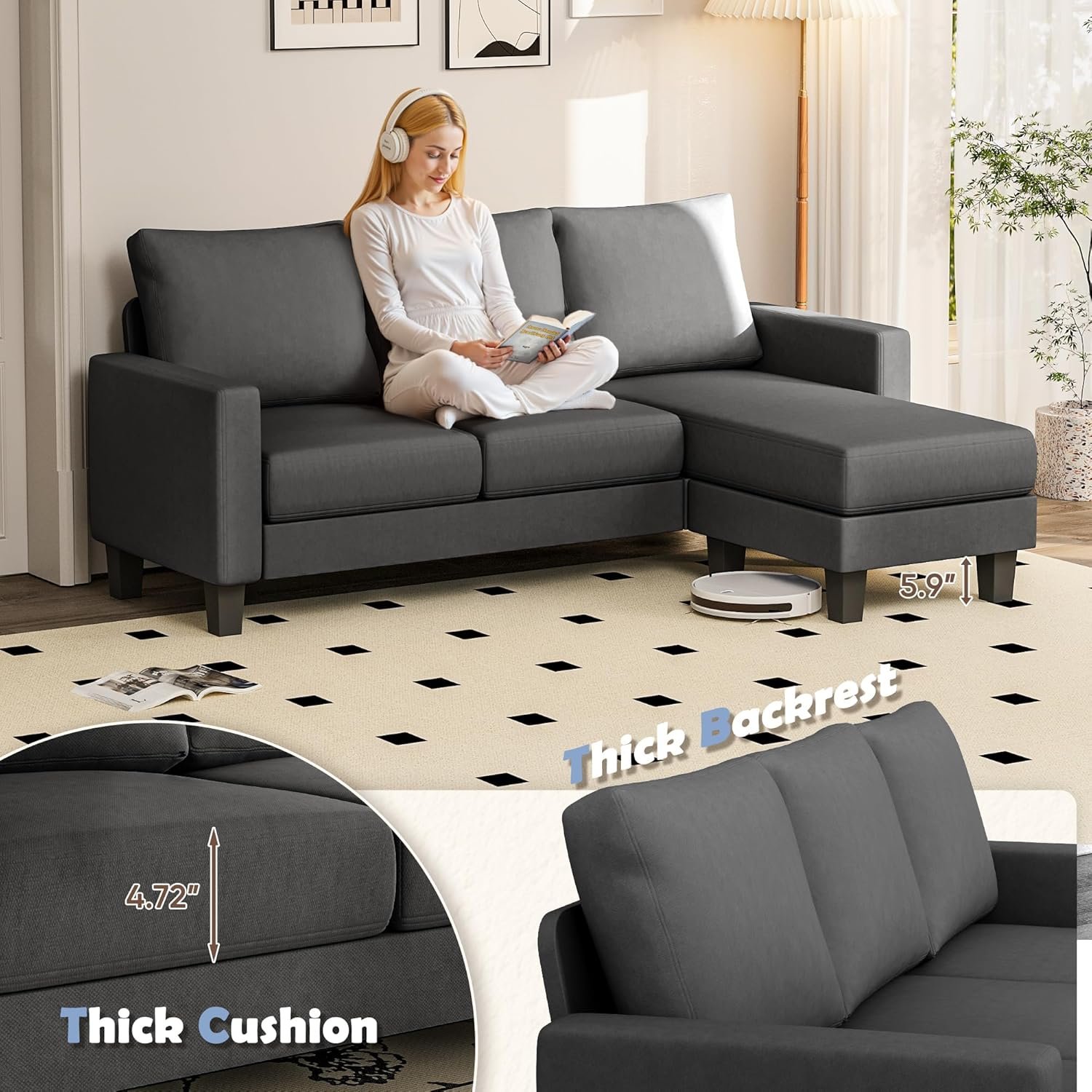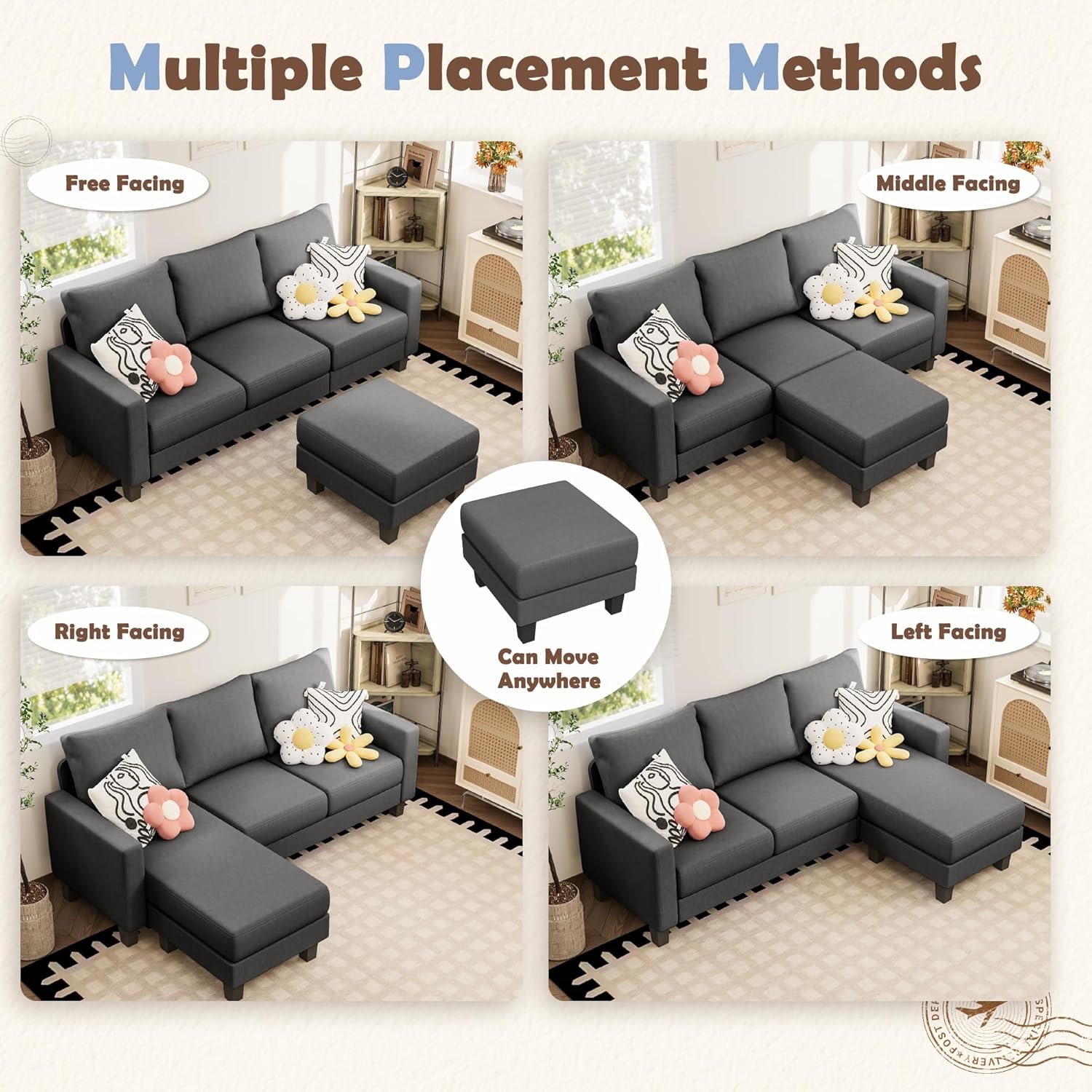 Flexible ottoman is space-saving. You can move it anywhereSmall sofa, please confirm the size of your room before purchasing2 separate boxes combine a couch, box may arrive at different timeCushions are vacuum-compressed, pat them, help them bounce back