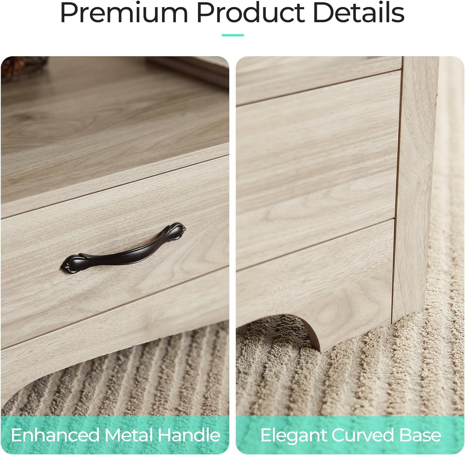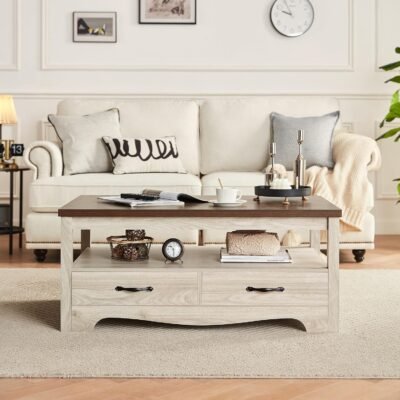 Elevate your living room with LINSY HOME’s Farmhouse Coffee Table. Enjoy charming details such as an enhanced base and curved design, while benefiting from the added storage space with open display and drawers.