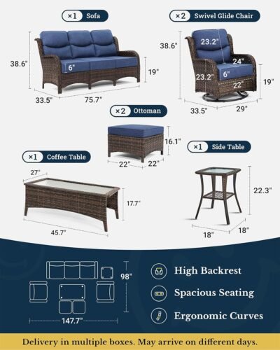 [Enjoy Indoor Comfort Outside] – Spending leisure time with family on HILLGA luxury outdoor furniture set is pure joy. Including two patio swivel rocking chairs,a 3-seat sofa, two ottomans, a coffee table and a side table, the patio coversation set is thoughtfully designed to fit in seamlessly with the outdoors, meeting your various social activities. To ensure delivery without any damage, they’re individually packed into 5 separate boxes and shipped as parts. Assembly is required, but don’t worry—we’ve included a clear assembly guide and a ratchet screwdriver to save more than 1 hour on installation time. (If any part is missing or damaged in transit, we’ll promptly send a replacement)