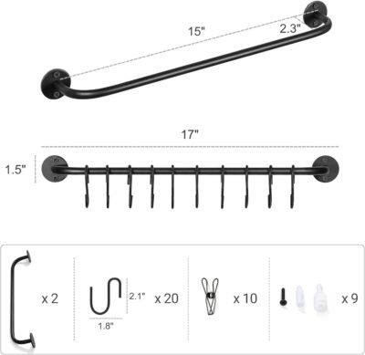 Package & Installation: Black hanging rod (17″ L x 2.3″ W x 1.5″ H) x 2, “S” shaped hooks (55 mm) x 20. “A” shaped clips x 10. Come with necessary screws, it is easy to install following the installation instructions