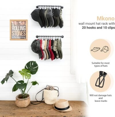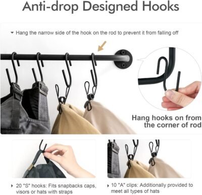 Big Capability Hat Rack for up to 20 Caps: This hat organizer for wall comes with 20 rust-resistant “S” hooks, which can hold 20 caps. Best for snapback caps, visors or hats with straps. Addictional provide 10 “A” clips to meet all types of hats storage needs. Hat rack wall mount is a perfect storage tool for caps storage, free up your closet space
