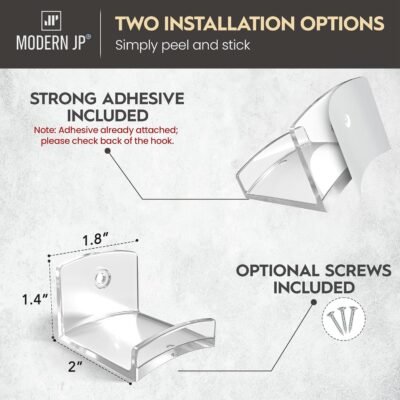 Install with adhesive or screws.Ensure the hook is the right side up – check the included card for reference.For the adhesive, wipe off any dust on the wall for a clean surface. Stick the hook on the wall and press firmly for 30 seconds. For best results, let the hook sit on the wall for 24 hours prior to use.