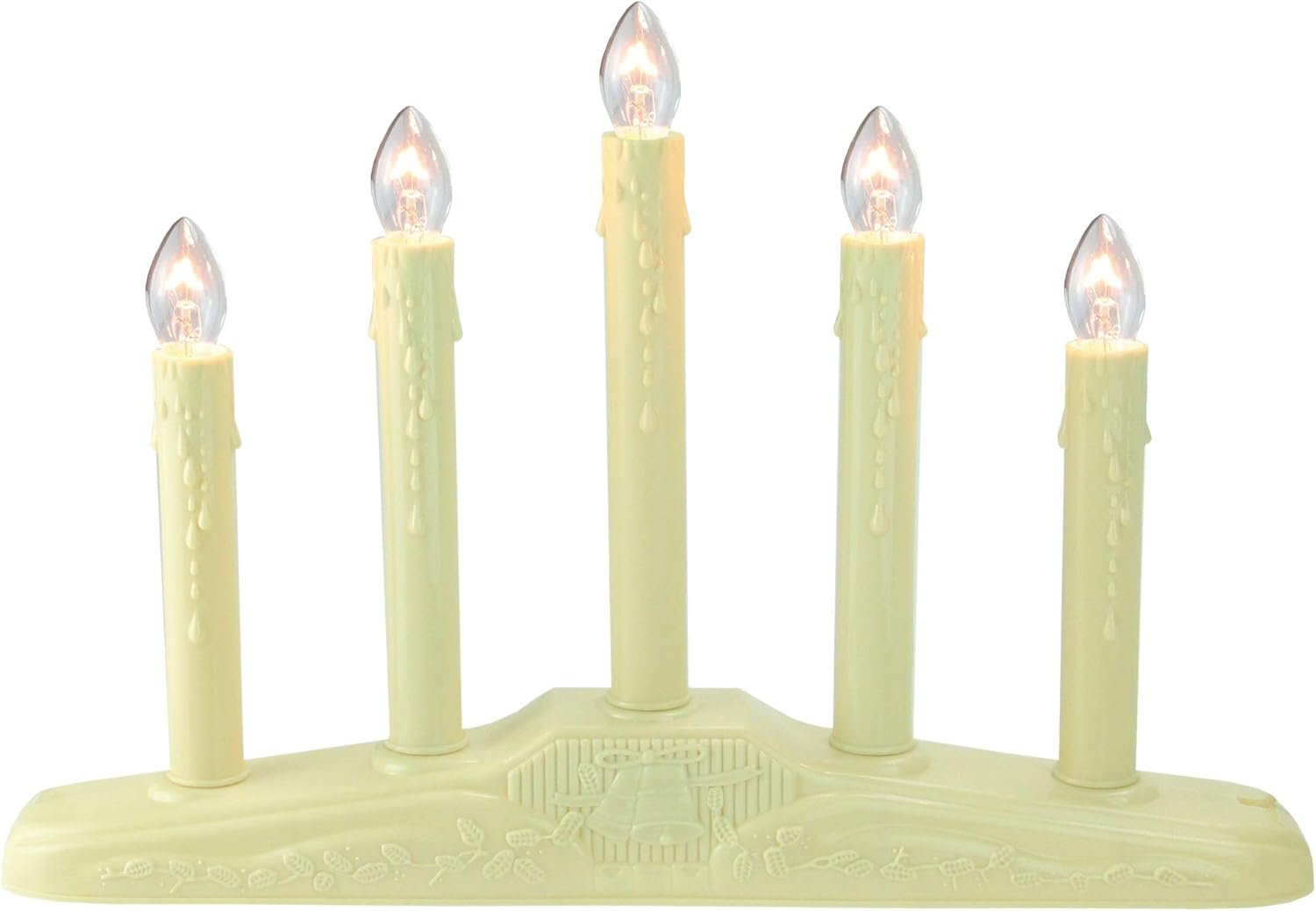 Holly and Christmas bells decorate the ivory base of this 5-light Christmas candelabra. Clear white C7 bulbs glow merrily in a candle branch featuring graduated size candles with dripping wax detail. Use as window candles or as part of a Christmas table arrangement for your traditional decor and let their warm glow welcome all who visit your home this holiday season. Product Features:. 5 candle tiered Christmas chandelier. Faux dripping wax detail on candles for a realistic charm. Flame-tip bulbs give the appearance of real flames. 5 C7 bulbs are included (5 watts each). Decorative base with bell and holly leaf molded design. Does not include on/off switch. 36″ ivory colored lead cord. Comes with replacement fuse and 1 spare bulb. UL certified and approved for indoor use only. 120 volts, 60 hertz, .125 amps, 15 watts Dimensions: 10″H x 14.5″W x 2.5″D. Material(s): plastic/glass bulb/wire