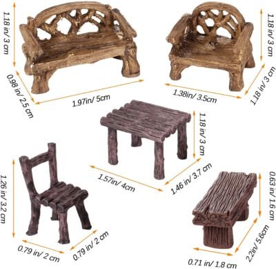 You will get: 12 pieces garden furniture ornaments, includes 2 miniature tables, 4 mini chairs, 2 mini benches and 4 backrest chair, nice for any garden, patio and desktop decor, essential for micro garden landscape DIY landscaping accessories