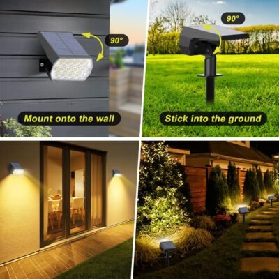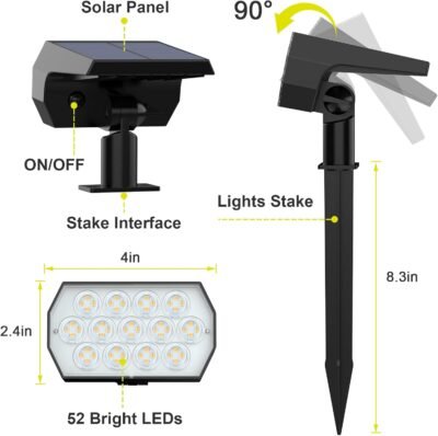 【Warm White 52 LED Spotlights】: Our 52 LED solar landscape spotlights outdoor with 90° adjustable head, use polycrystalline silicon solar panels, the energy conversion rate is as high as 20%, and the charging efficiency is higher than competing solar lights. and coordinate well with all different styles of decoration. The solar garden lights illuminate and make your home feel safer and more welcoming.