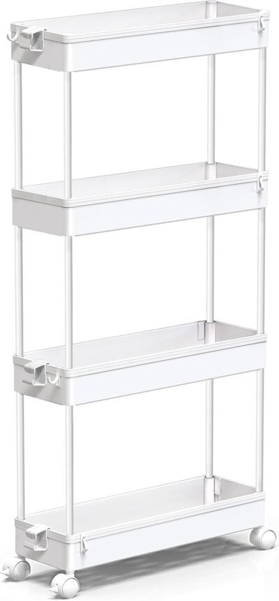 【Flexible 4 Tier Storage Cart】- The 4-tier slim storage cart is 4.75 in design which can be used in tight spaces in your home for storage. Suitable for closets, kitchens, bathrooms, garages, laundry rooms, offices or in-between your washer and dryer.
