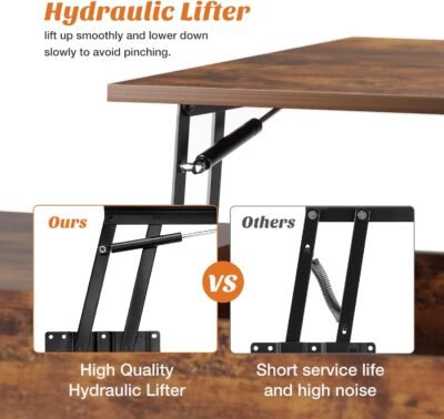 Spacious Storage: The large hidden compartment under the top table offers enough space to store your books, cups, games, snacks, keeping them away from dirt. The lifting mechanism won’t take up a lot of room inside the storage part. The two shelves on the side offer extra space, saving so much time for you not having to dig around the living room to find remotes or tissue boxes.