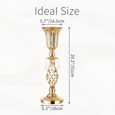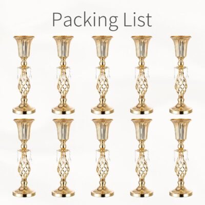 Size & Packing List: Height: 20.2″, Bottom diameter: 6.3″, Top diameter: 5.7″. Packing list: 10pcs gold vases. Warm tips. 1. Fake flowers are not included. 2. These wedding reception vases cannot hold water. 3. If you need to use them outdoors, put some stones inside, the vases will be more stable.