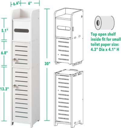 【Perfect Slim Design for Small Spaces】Our small bathroom storage fits anywhere of your house, small size 6″W x 6.4″D x 30″H can fit any tight spaces, it’s the perfect size to exploit the tight space a small bathroom features. This sleek slim & space-saving design storage cabinet can not only use as a bathroom storage cabinet, also suitable for bedroom and living room organizer.