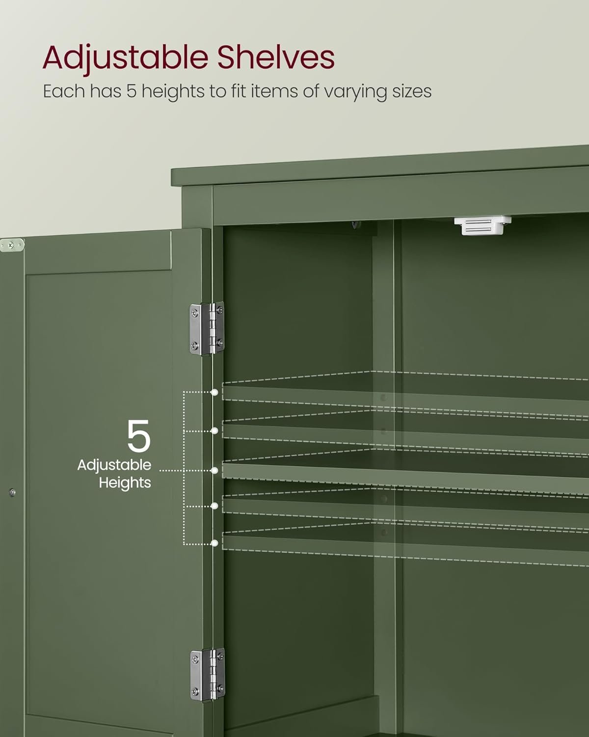 [Customizable Storage] Easily adjust the shelf in each cabinet to 5 different positions, providing the flexibility to accommodate items of varying heights