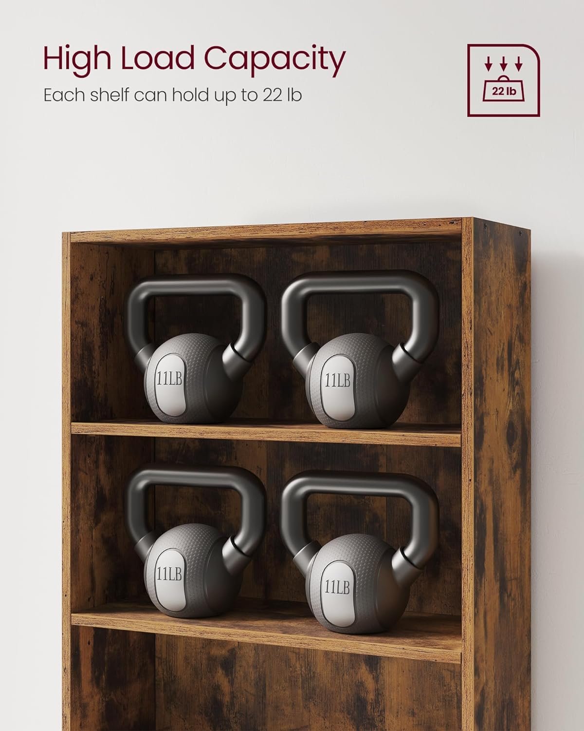 Color: Rustic BrownMaterial: ParticleboardProduct Size: 9.4″D x 23.6″W x 52.8″H (24 x 60 x 134.2 cm)Product Weight: 37.6 lb (17.1 kg)Max. Static Load Capacity per Shelf: 22 lb (10 kg)Max. Static Load Capacity Total: 132 lb (60 kg)