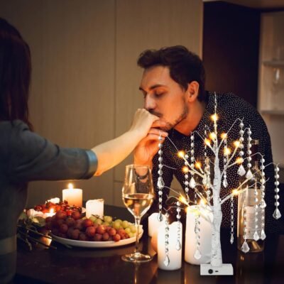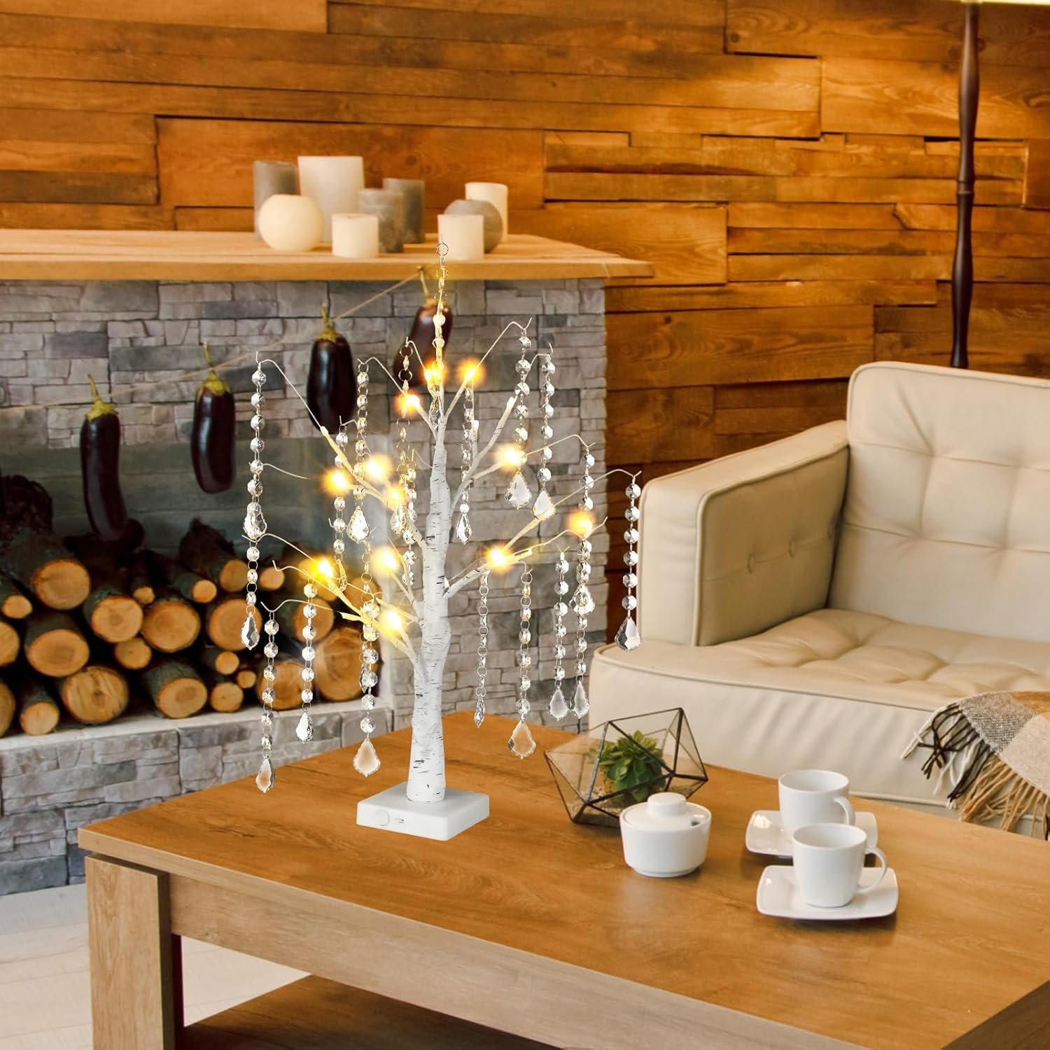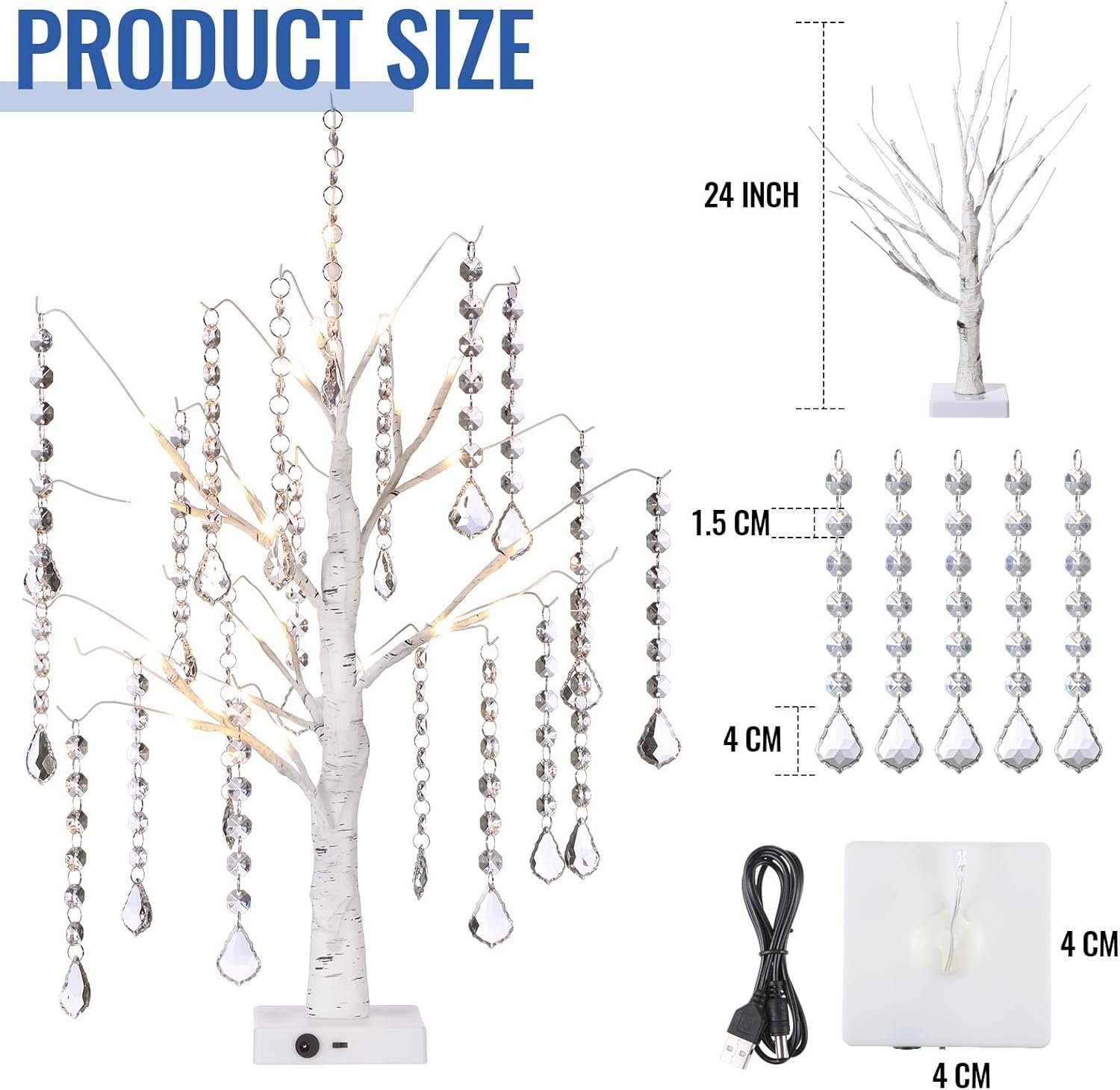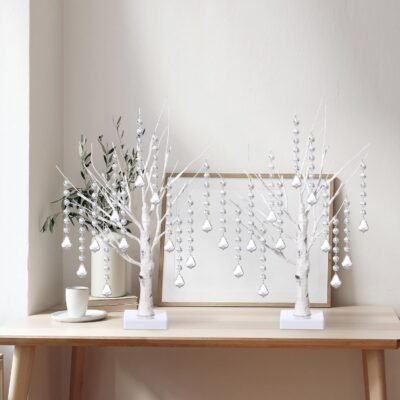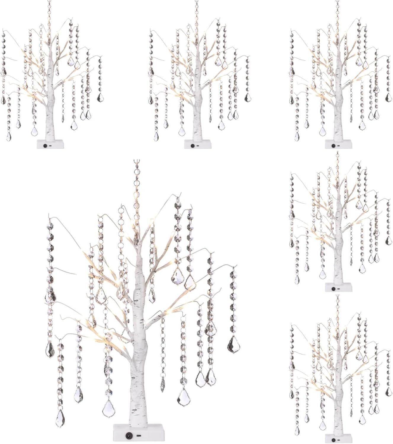 Create Elegant Atmosphere: 6 pcs 2 ft artificial white birch trees with 24 LED lights and 4″ x 4″ base, ; 72 strings of acrylic crystal garland strands, enough quantity to meet your needs for DIY birch tree centerpiece decoration; This elegant tree is a suitable gift for Halloween, Christmas and other festivals
