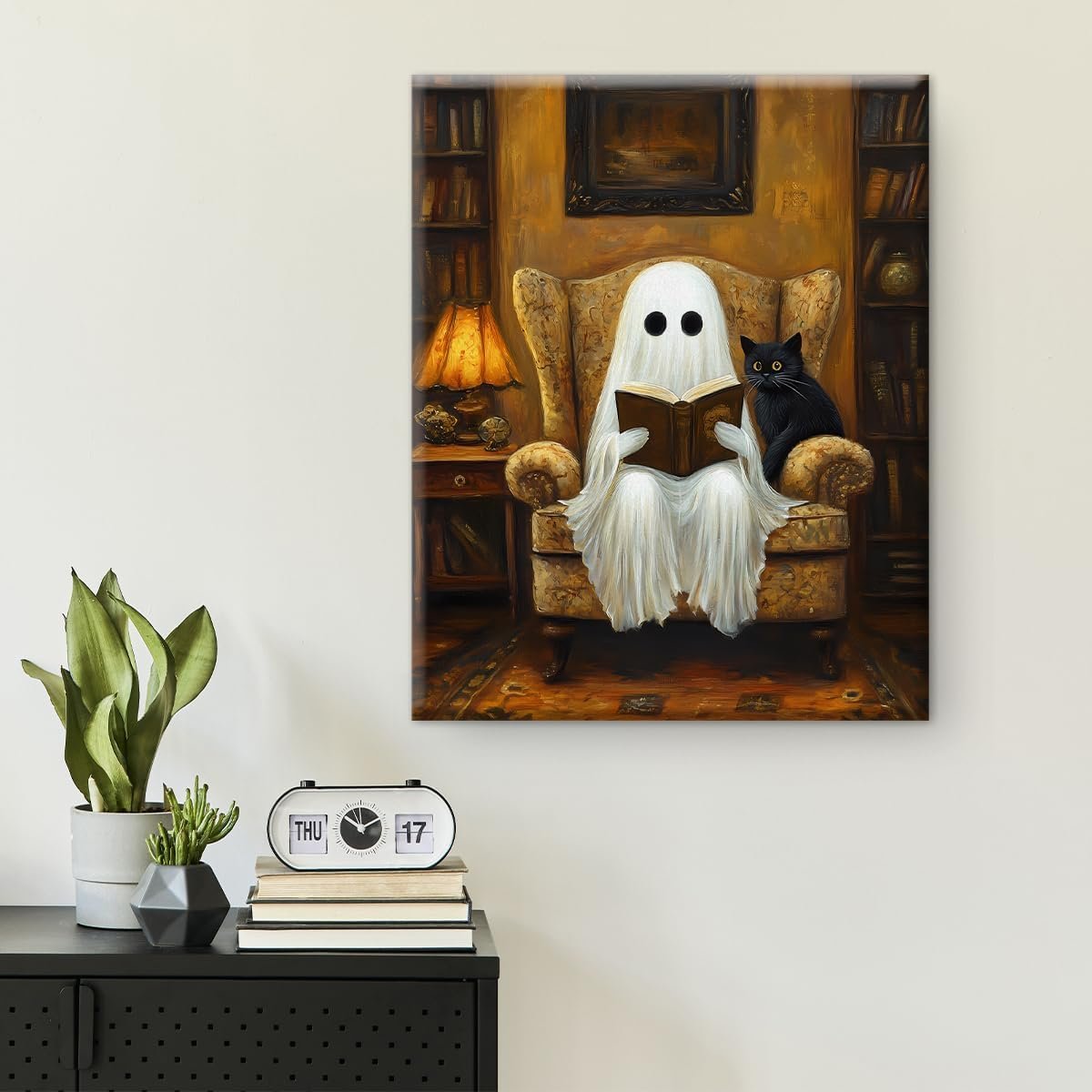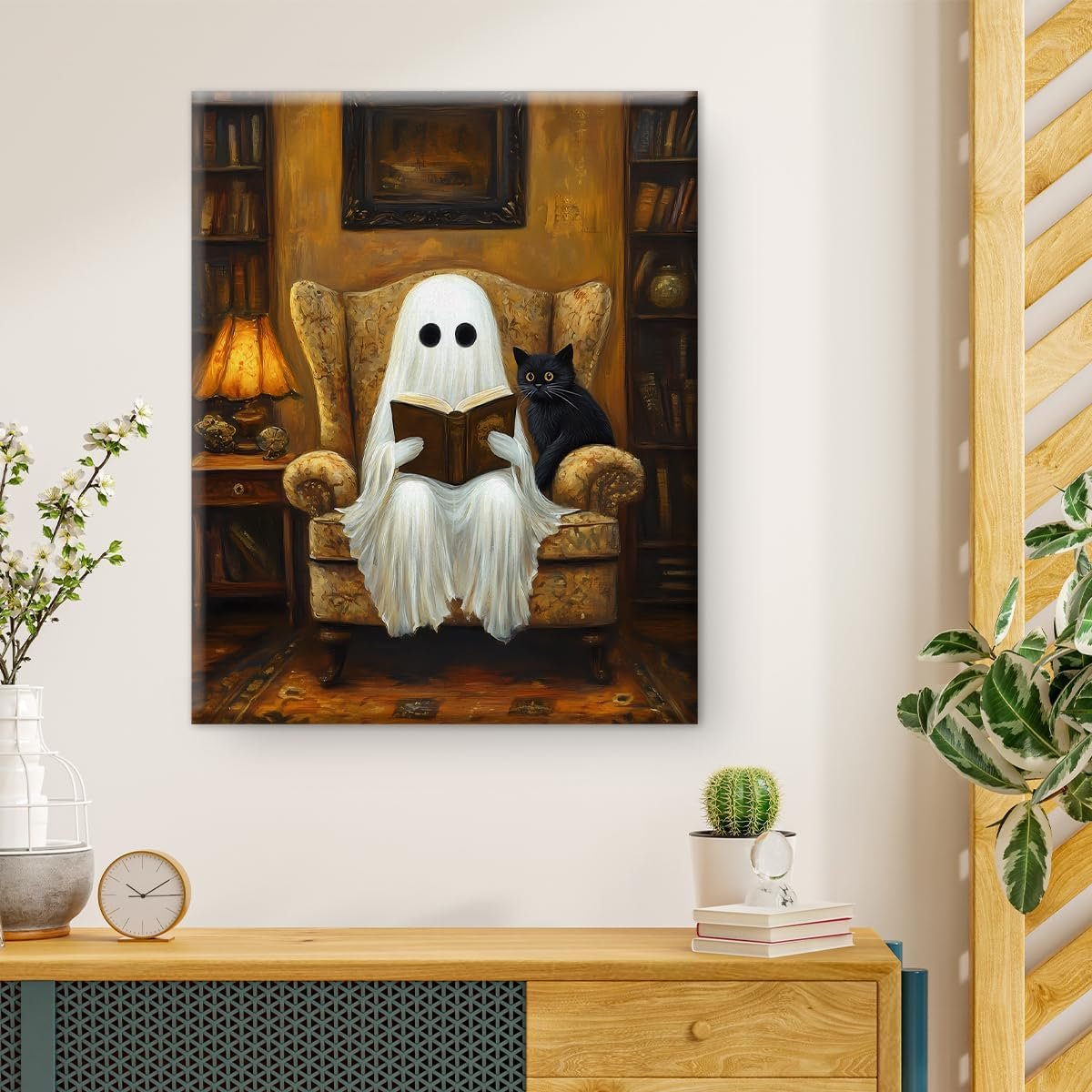 Whimsical Ghost Cat Canvas Wall Art Print Spooky Dark Academia Ghost Picture Poster Goth Framed Painting Wall Decorations for Home Living Room Reading Room, Halloween Decor 8×10 Inches