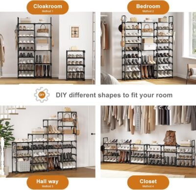 9-Tier Shoe Rack:Featuring a compact profile, you can easily set this shoe rack in the hallway, living room, bedroom,or garage. It helps you maximize your vertical space while saving more floor space for other items.The product is designed to be disassembled and assembled freely. You can remove the five layers to store boots, high heels or other larger accessories to suit different scenarios