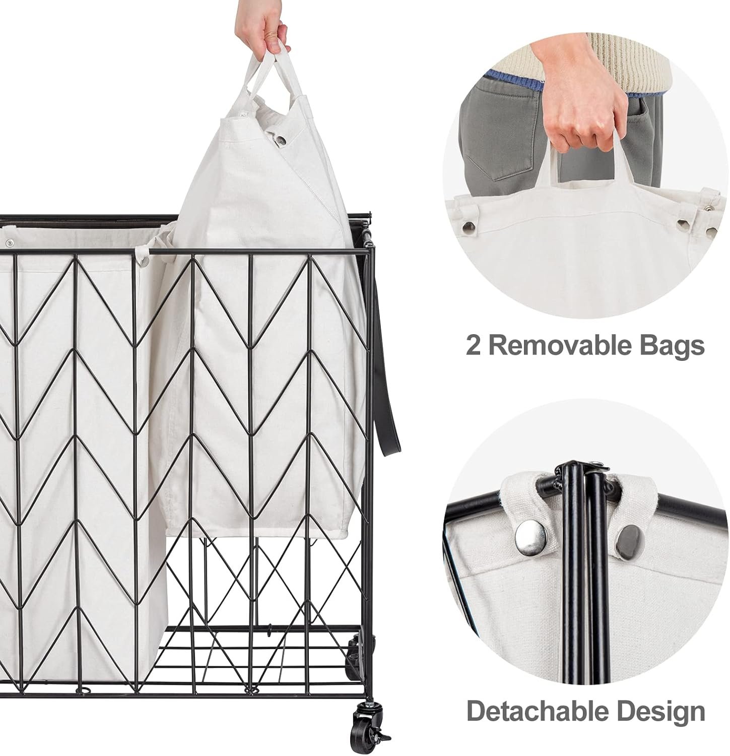 Large Capacity; Sort Laundry: The laundry basket has 2 bags with sufficient capacity (each laundry basket holds 57.5 L, a total of 115 L), helps you sort your clothes by color and material, keeps your clothes neatly organized and saves your time